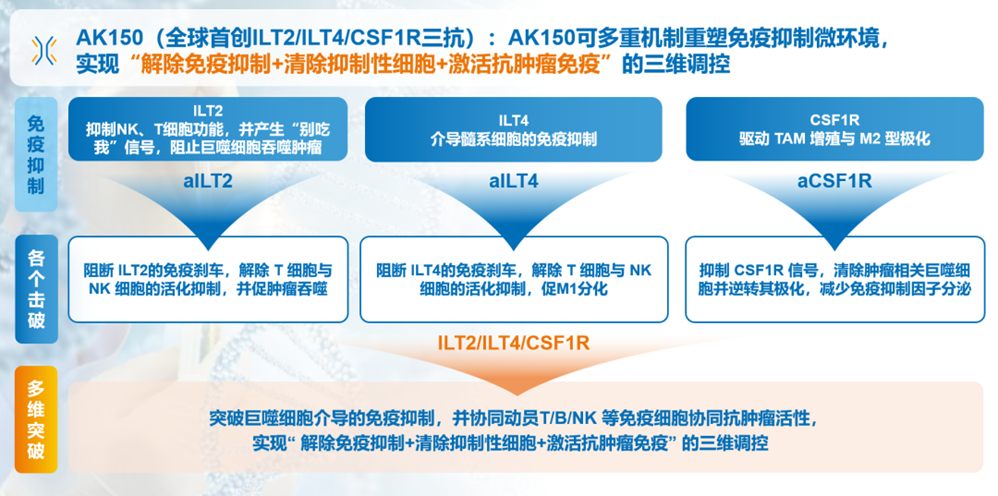 AK150可同时靶向ILT2、ILT4、CSF1R三个靶点,实现协同抗肿瘤,具有同时调节先天免疫和取得性免疫系统的作用,既对热肿瘤具有高效治疗潜力,还可以将冷肿瘤向热肿瘤转换,有望从根本上改善并提高肿瘤对免疫治疗的有效性。